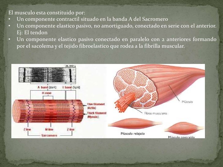 • Un componente elástico pasivo conectado en paralelo con 2 anteriores formando por el sarcolema y el tejido fibroelastico que rodea a la fibrilla muscular.